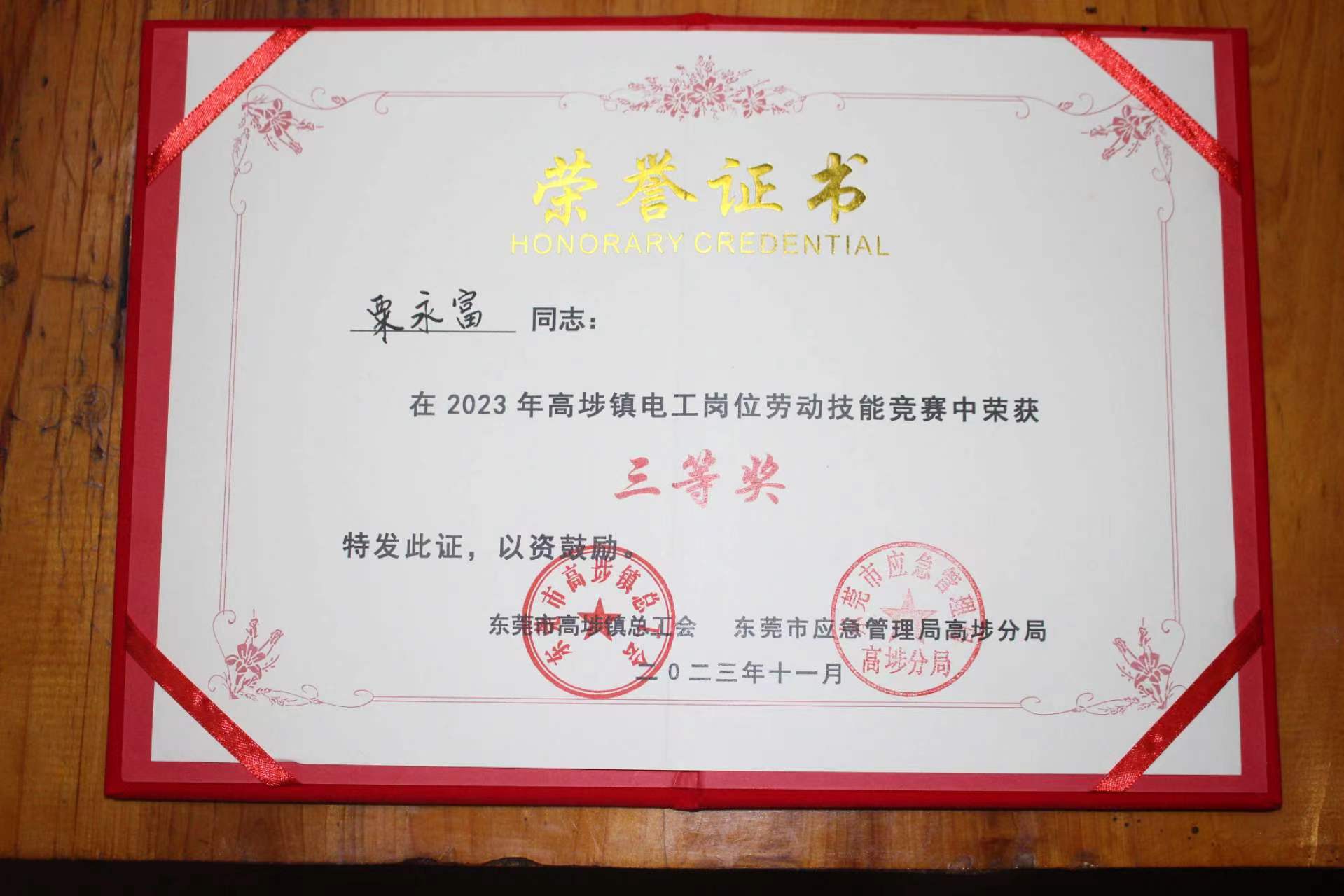 “高埗鎮(zhèn)電工技能競賽三等獎”