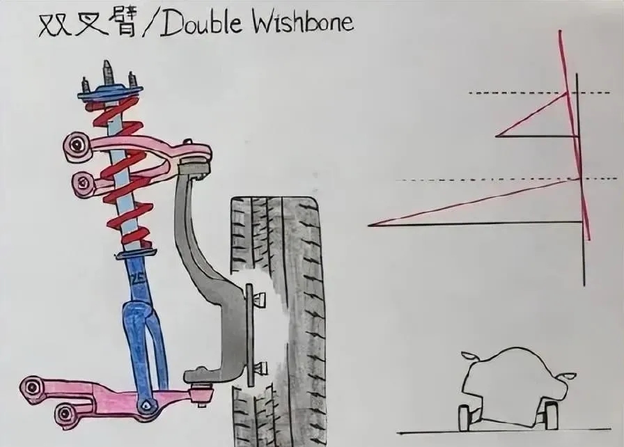 雙叉臂懸掛可以看作是麥弗遜懸掛的改良升級(jí)版。它將原本由麥弗遜下臂單獨(dú)承受的力分散到了兩根連桿上。其最大優(yōu)點(diǎn)在于,動(dòng)態(tài)行駛中由于上臂短于下臂,能夠改變車輪的外傾角,從而顯著提升車輛的極限操控性能。不過,與麥弗遜懸掛相比,雙叉臂懸掛的成本更高,且占用空間更大。橡膠墊圈的作用