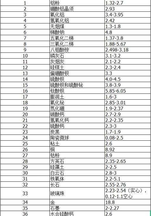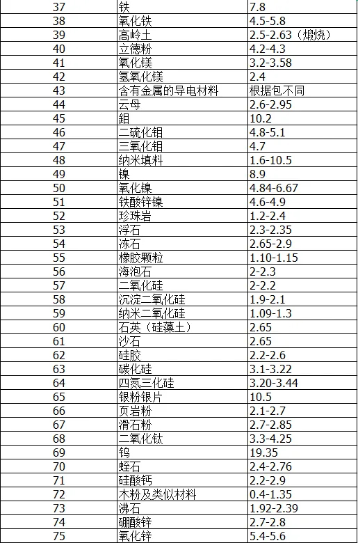 橡膠常用助劑比重表2