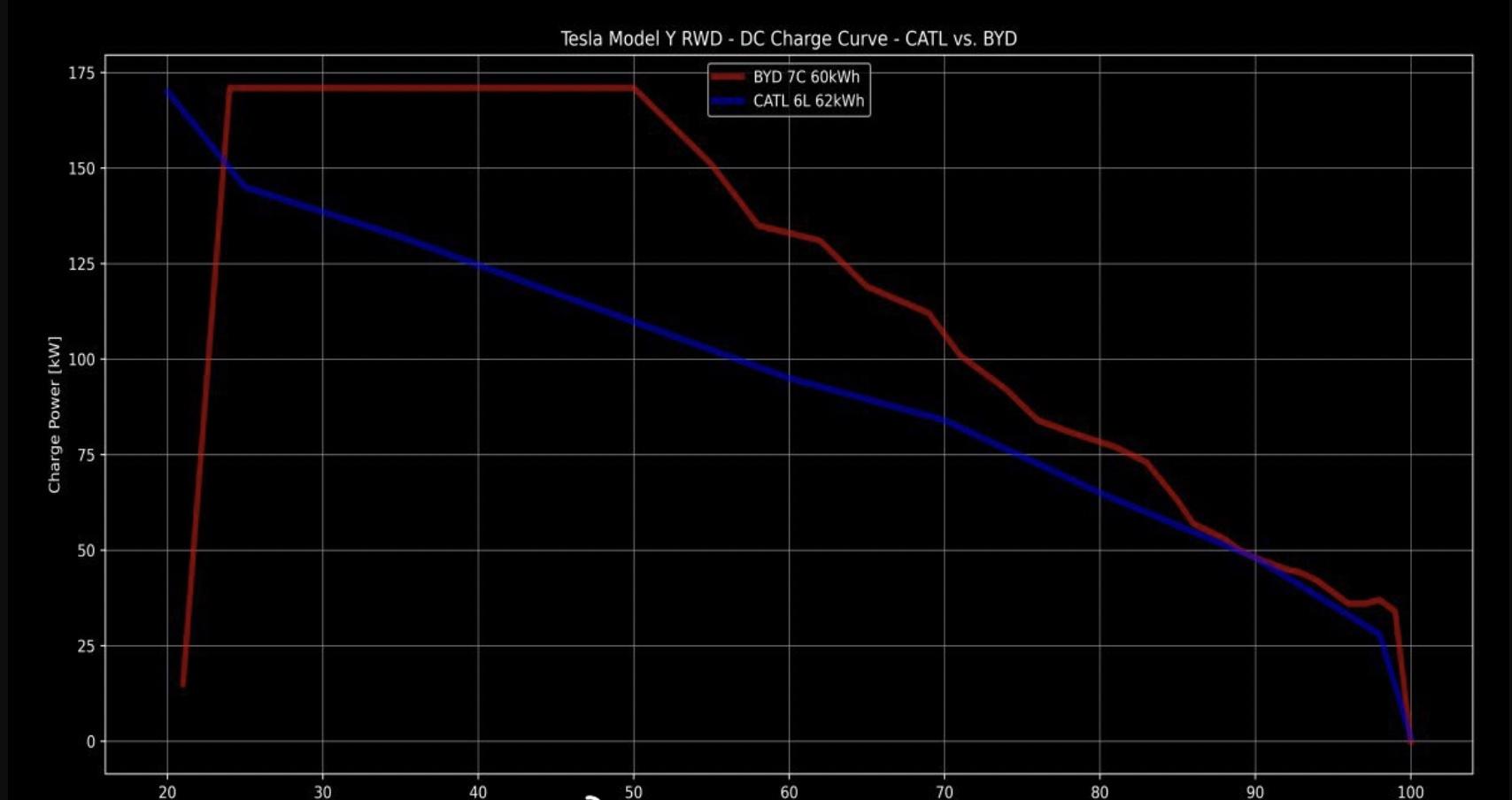 有用戶分享了這款車型的實(shí)測(cè)充電功率數(shù)據(jù),刀片電池版本的Model Y充電峰值功率達(dá)到170kW以上,15分鐘就能從11%充至71%。對(duì)比寧德時(shí)代版本,可以看到比亞迪版本的高功率充電時(shí)間維持的更長(zhǎng),充電功率也比較高。